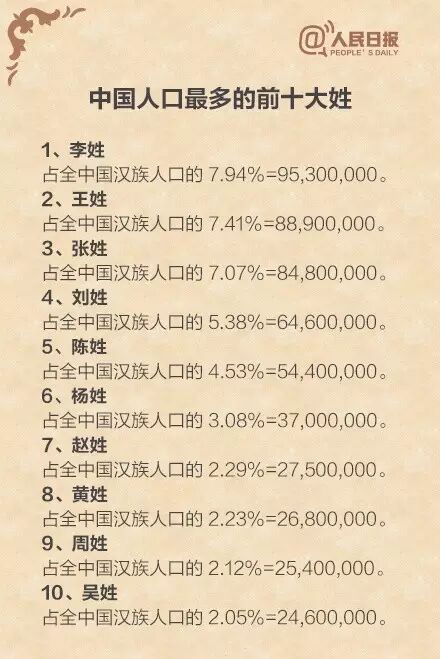 是目前中国人口最多的五大姓,人口近4亿。