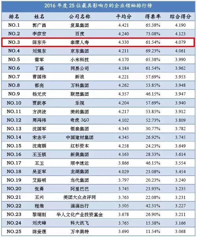 陈东升名列企业领袖榜单第三位