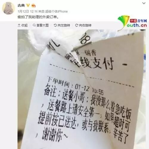 近日,一段外卖小哥因送餐超时急哭了的视频在网上热传。12日,网友于女士在微博晒出她的外卖订单,备注中写道“送餐小哥:我没那么着急吃饭,送餐路上请安全第一”,引得网友点赞。